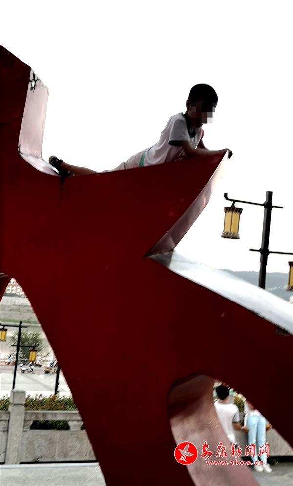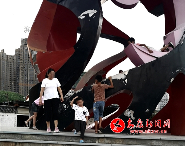 近日,記者在漢調二黃文化園看到,游玩的市民絡繹不絕,大部分市民都能做到文明游園,但其中也存在不文明行為。這里是文化園主題雕塑,幾個10歲左右的小男孩不斷攀爬雕塑,并在離地面約2米的高處逗留,現(xiàn)場既無工作人員勸導也沒有“禁止攀爬”的相關提示牌。記者 潘潤生 攝