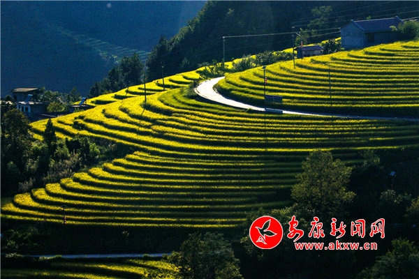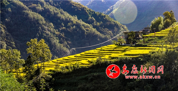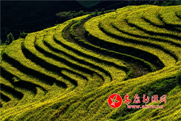 放眼望去,黃亮亮的稻谷,層層疊疊,從山底一直鋪到半山腰。水田都是依山而修,隨山形而變,高差均是隨坡放緩,形狀雖不十分規(guī)則卻也精巧,動人之處全在自然的水平線上。