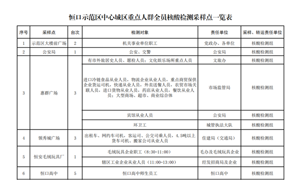 按行業(yè)、類別、區(qū)域,共設(shè)置19個(gè)采樣點(diǎn)、40個(gè)采樣臺(tái)(見(jiàn)附件),具體由各行業(yè)牽頭部門(mén)、責(zé)任單位統(tǒng)一安排采樣點(diǎn)設(shè)置、人員組織、秩序維護(hù),檢測(cè)對(duì)象按照牽頭部門(mén)、責(zé)任單位的具體要求,分時(shí)段有序到指定地點(diǎn)進(jìn)行采樣,避免人群聚集。