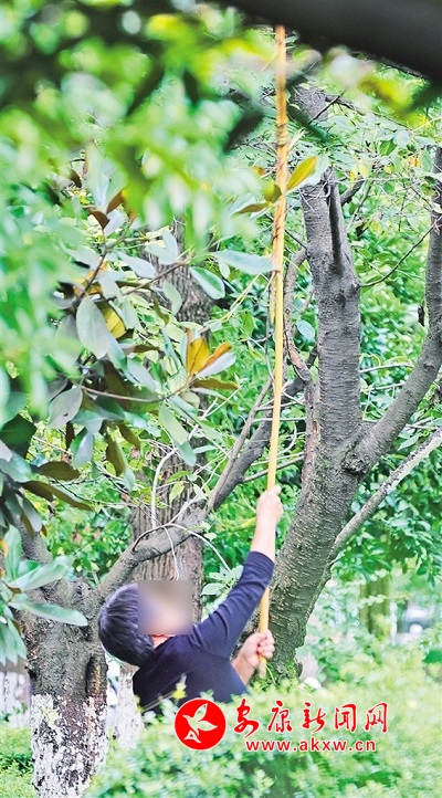 市民拿著長(zhǎng)桿在景區(qū)附近采摘果實(shí)
