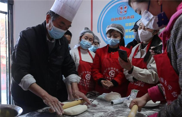 △學(xué)員們跟著師傅認(rèn)真學(xué)習(xí)面點(diǎn)技能