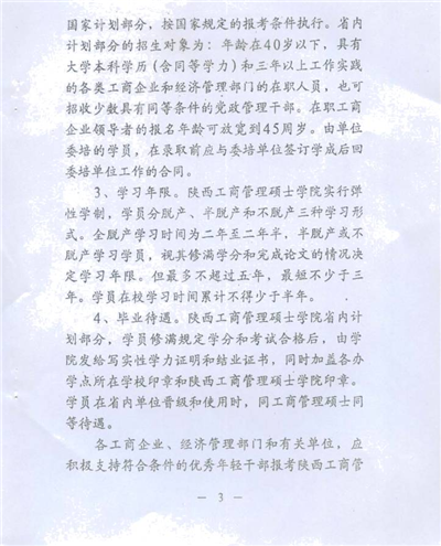 按照省政府有關(guān)文件規(guī)定,學(xué)員修滿規(guī)定的課程學(xué)分,完成畢業(yè)論文,通過論文答辯及評審后,由陜西工商管理碩士學(xué)院頒發(fā)畢業(yè)證書和學(xué)力證明。學(xué)員在省內(nèi)單位晉級和使用時(shí),視同工商管理碩士。