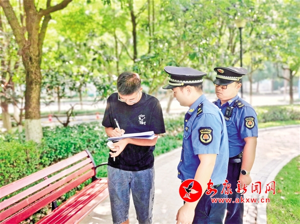 連日來,漢濱區(qū)、高新區(qū)城管部門在中心城區(qū)全域持續(xù)開展“文明有我 痰吐文雅”專項糾治執(zhí)法行動。城管執(zhí)法人員依據(jù)規(guī)定,對“隨地吐痰”等不文明行為人,處以十元以上五十元以下的罰款,或以發(fā)朋友圈集贊的方式接受柔性執(zhí)法免于罰款。據(jù)統(tǒng)計,截至9月6日,已開展現(xiàn)場處罰258人次,其中開具罰單62張。圖為隨地吐痰的市民正在接受行政處罰。屈明佳 攝