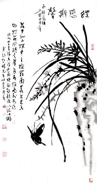 1988年,中國畫壇號稱“蝶王”的王冰如女士,以80歲高齡回到她曾工作生活10年之久的第二故鄉(xiāng)安康舉辦畫展,并且以詩書畫會友,特邀旸光先生和金州著名詩人劉寅初老人同游香溪,冰如老師興之所至,巧繪墨蝶,說道“人言寅初老弟有曹子健七步成詩之才,今日以十步為限,將此畫為題,賦詩一首,旸光老弟書于其上如何?”寅初老只走了三步便道有了,于是順口吟誦,旸光先生揮毫急就“花中仙子蝶中王,蝶舞籣叢花更香,化蝶莊周終是夢,喜看蝶王飛安康?!币还P流暢的行草躍然于畫上,相輔相成,真是詩情畫意天作之合。一幅難遇難得難覓的“三絕圖”誕生了。冰如老師感慨萬千,說到“二位弟臺才高八斗,只可惜待在安康這個貧瘠的地方被埋沒了也!”這個場面是一種巧合,正是旸光先生“萬事隨緣”的結(jié)晶,爾后經(jīng)書壇大家陳少默先生為之題跋做款,更是錦上添花,成了四絕圖。冰如、少默、旸光、寅初先生已然作古,這段翰墨丹青之情,將永存世間傳為藝術(shù)佳話。