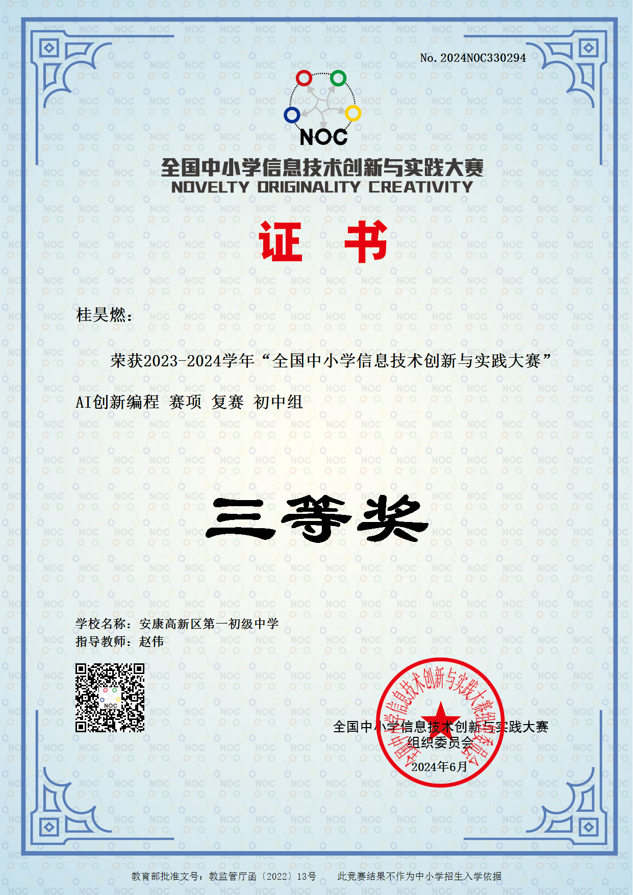 據悉,“全國中小學信息技術創(chuàng)新與實踐大賽(NOC,全稱為Novelty, Originality, Creativity)”是全國性的權威賽事,屬教育部白名單賽事,是一項運用信息技術,培養(yǎng)廣大師生的創(chuàng)新精神和實踐能力,面向青少年學生開展人工智能科學普及、引領科技創(chuàng)新的素質教育實踐平臺。??