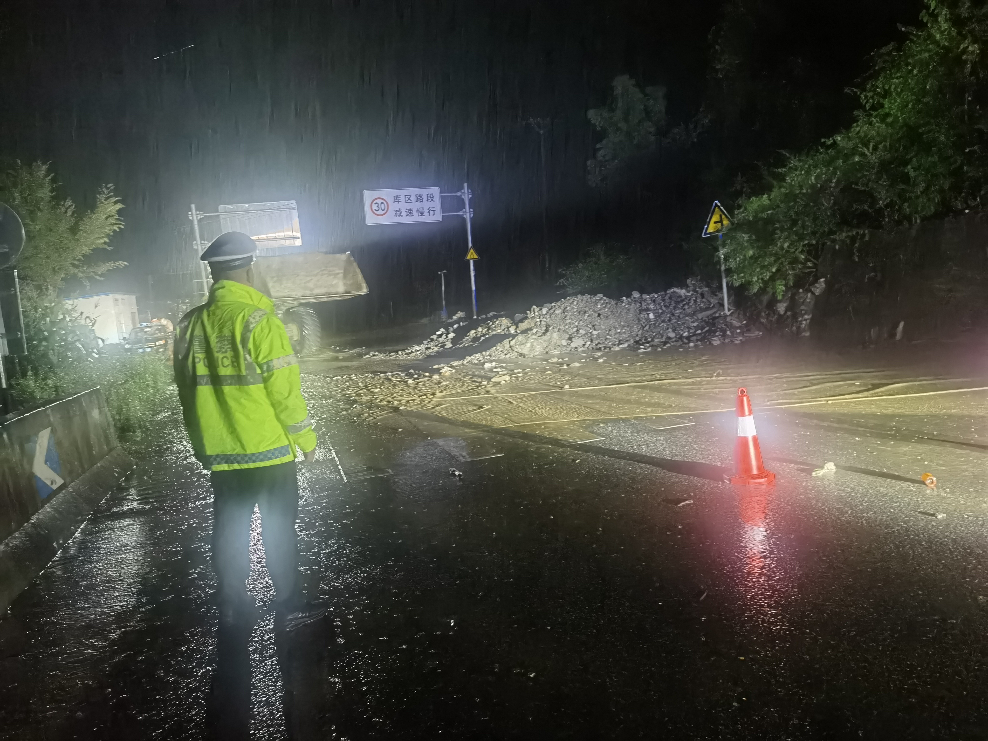 旬陽市公安交警持續(xù)堅(jiān)守防汛一線,無畏風(fēng)雨、無懼危險(xiǎn),開展交通管控、救援救助、應(yīng)急處突、隱患排除等相關(guān)工作,全力保障人民群眾生命財(cái)產(chǎn)安全。暴雨中,交警身著熒光綠雨衣,不畏風(fēng)雨,堅(jiān)守在重要路段,對(duì)有滑坡、落石等危險(xiǎn)路段及具有安全風(fēng)險(xiǎn)的臨水臨崖路段,采取臨時(shí)禁行的管制措施,引導(dǎo)過往車輛繞行,注意行車安全,協(xié)同相關(guān)部門現(xiàn)場(chǎng)進(jìn)行清理,對(duì)不能現(xiàn)場(chǎng)處理的隱患及時(shí)上報(bào),確保排險(xiǎn)不留盲點(diǎn)、隱患不留死角。同時(shí)加強(qiáng)道路的巡邏管控,通過遠(yuǎn)端分流,引導(dǎo)車輛、行人安全有序通行,確保群眾出行安全。以雨為令,以夜為伴,逆風(fēng)而行,通宵達(dá)旦,風(fēng)雨中,一抹抹“熒光綠”在熠熠閃光。
