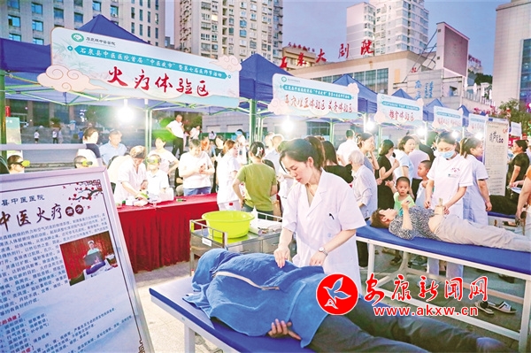 當晚,石泉縣中醫(yī)醫(yī)院在春潮廣場設置中醫(yī)健身操八段錦、中草藥科普、中藥養(yǎng)生茶免費飲用及展示、古法中藥香囊制作體驗、中醫(yī)護理適宜技術體驗、中醫(yī)體質辨識與調養(yǎng)指導、健康咨詢等7個主題專區(qū),向市民展示中醫(yī)健身操、中草藥等,邀請市民飲用烏梅茶、美容養(yǎng)顏茶,體驗中藥香囊制作過程,向市民講解中草藥知識,為市民免費查體,提供健康咨詢和推拿、艾灸、刮痧、拔罐、火療等多種中醫(yī)療法服務,吸引了眾多市民體驗。
