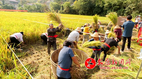 穗滿田頭谷滿倉,稻魚飄香慶豐年。稻田里,緊張激烈、歡快熱鬧的割稻、甩谷及釣魚比賽正在進(jìn)行,只見一株株水稻隨著鐮刀的刷刷聲倒下,一把把稻穗隨著摔打脫落為金色的谷粒,一條條稻魚在手中躍動,大家爭分奪秒、你追我趕,一派熱火朝天的景象。