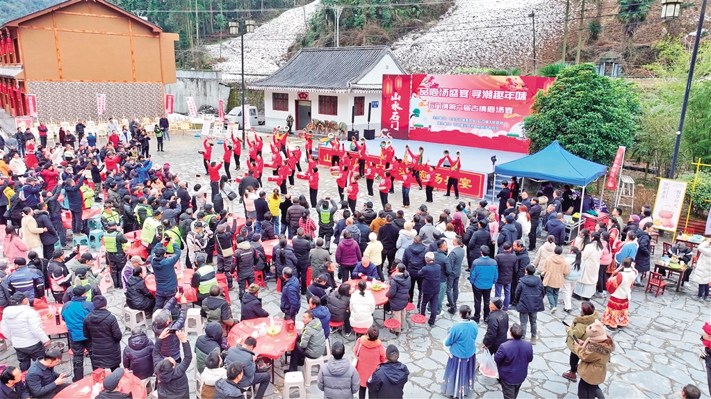 據(jù)了解,為了準(zhǔn)備此次庖湯宴,去年12月底,石門鎮(zhèn)總投資120余萬(wàn)元開始進(jìn)行橫溪古鎮(zhèn)舊房改造提升項(xiàng)目,著力打造“古鎮(zhèn)庖湯宴”品牌。經(jīng)過(guò)項(xiàng)目改造,古鎮(zhèn)完成全面升級(jí)。不僅如此,石門鎮(zhèn)政府還不斷通過(guò)“線上+線下”的宣傳方式,提升當(dāng)?shù)芈糜螛I(yè)影響力,積極制作旅游宣傳視頻,此次活動(dòng)帶動(dòng)引流2000人次。(柯明宇 攝)