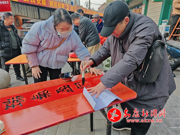 義寫(xiě)現(xiàn)場(chǎng),10余位書(shū)法家們凝神提筆,為社區(qū)群眾潑墨獻(xiàn)藝,楷書(shū)、行書(shū)、隸書(shū)等各種字體躍然紙上。“一帆風(fēng)順年年好,萬(wàn)事如意步步高”“蛇舞春風(fēng)傳喜訊,燕歸故里報(bào)佳音”等一副副寓意吉祥的春聯(lián)在筆下完成,一副副精心創(chuàng)作的年畫(huà)躍然紙上,令人賞心悅目,更有書(shū)法愛(ài)好者踴躍加入,與老師們互動(dòng)交流。社區(qū)的紅馬甲志愿者忙碌著分發(fā)、晾曬春聯(lián),聞?dòng)嵍鴣?lái)的群眾絡(luò)繹不絕,大家拿著手寫(xiě)的春聯(lián)和年畫(huà),喜悅之情溢于言表。本次活動(dòng)共書(shū)寫(xiě)對(duì)聯(lián)300余副,“?!弊?00余張,送出國(guó)畫(huà)作品40余幅。