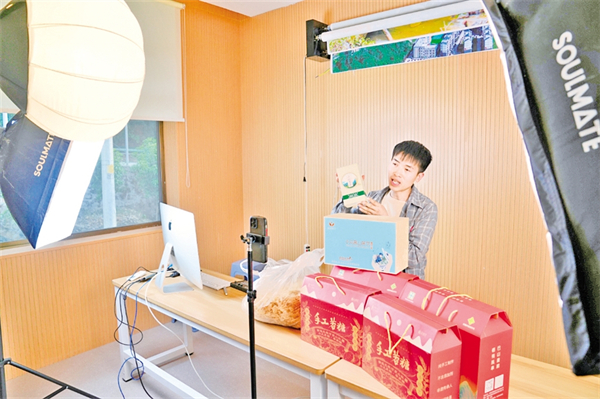 王幫樂在石門鎮(zhèn)電商直播基地銷售當季的小溝茶葉