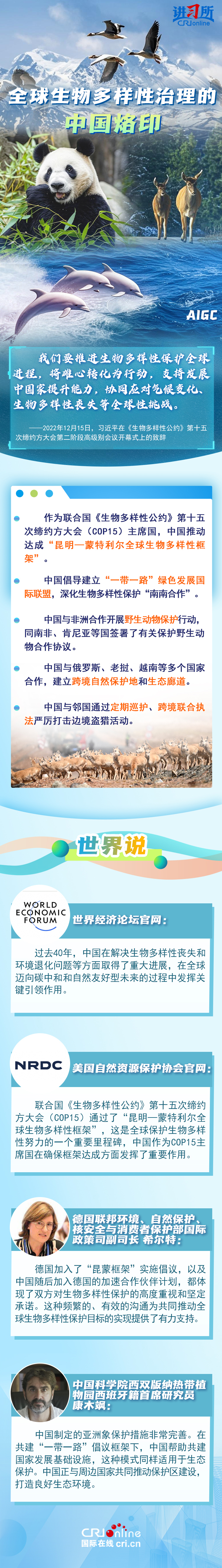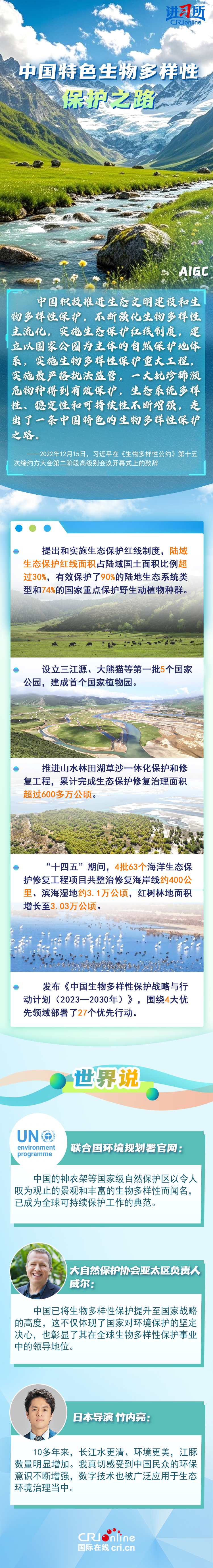 “心往一處想、勁往一處使,共建地球生命共同體?!弊鳛樽钤绾炇?、批準《生物多樣性公約》的締約方之一,生物多樣性保護已經(jīng)上升為中國的國家發(fā)展戰(zhàn)略。國際人士表示,中國的一系列舉措體現(xiàn)出對生態(tài)環(huán)境保護的堅定決心,同時,中國依托共建“一帶一路”倡議等國際合作機制,為推動全球生物多樣性保護提供了有力支持,在邁向自然友好型未來的過程中發(fā)揮關鍵的引領作用。