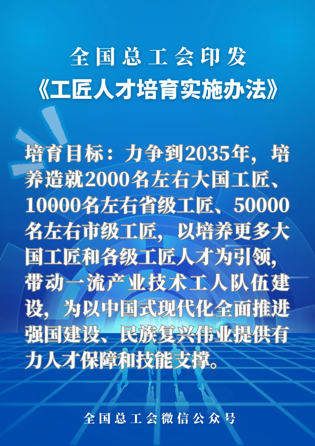 第二條 培育目標是,力爭到2035年,培養(yǎng)造就2000名左右大國工匠、10000名左右省級工匠、50000名左右市級工匠,以培養(yǎng)更多大國工匠和各級工匠人才為引領,帶動一流產(chǎn)業(yè)技術工人隊伍建設,為以中國式現(xiàn)代化全面推進強國建設、民族復興偉業(yè)提供有力人才保障和技能支撐。