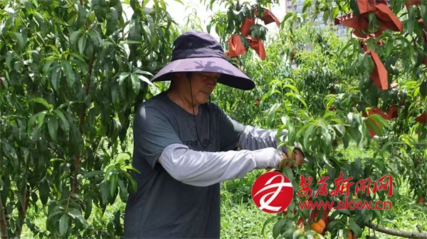 同樣迎來收獲的還有城關(guān)鎮(zhèn)的黃桃,在城關(guān)鎮(zhèn)龍嶺村的黃桃種植基地,連片的桃樹郁郁蔥蔥,金燦燦的黃桃壓彎了枝條,空氣中彌漫著誘人的桃香。基地負責(zé)人劉宏正忙著采摘,臉上洋溢著燦爛的笑容,他一邊采摘一邊介紹道:“我們這個桃園有金鳳黃桃、黃金黃桃、秋彤桃和冬桃四個品種,一共有9畝多,從6月中旬到10月左右,陸續(xù)都有成熟的桃子。”