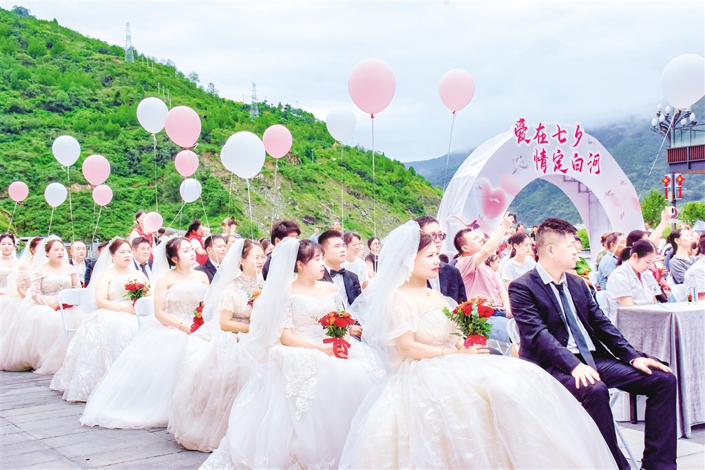 ?8月29日上午,“愛(ài)在七夕·情定白河”2025年白河縣新時(shí)代文明實(shí)踐集體婚禮主題活動(dòng)在河街寶石文化廣場(chǎng)浪漫啟幕。來(lái)自各行各業(yè)的8對(duì)“珍珠婚”夫婦、8對(duì)新人齊聚一堂,通過(guò)分享婚姻保鮮秘訣、頒發(fā)結(jié)婚證、簽訂承諾書、開(kāi)展婚姻家庭輔導(dǎo)等簡(jiǎn)約而莊重的儀式,在各界代表和親朋好友的見(jiàn)證祝福下,開(kāi)啟幸?;橐鲂缕拢脤?shí)際行動(dòng)踐行婚事新辦、喜事儉辦的文明新風(fēng)尚。(紀(jì)道婭 攝)