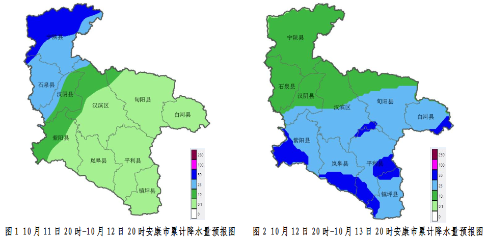 10月12日:全市大部陰天轉(zhuǎn)大雨(25~45毫米),紫陽(yáng)大部、嵐皋南部、平利中南部、鎮(zhèn)坪、漢濱南部、白河局地有暴雨(超過(guò)50毫米),過(guò)程期間局地伴有雨強(qiáng)超過(guò)10毫米/小時(shí)的強(qiáng)降水;