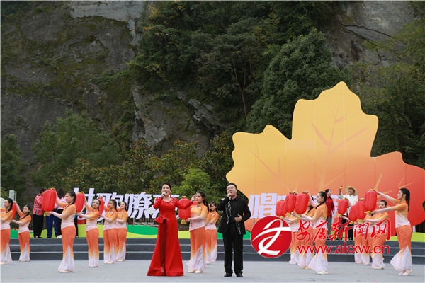 金秋時節(jié)的茨溝鎮(zhèn),萬畝紅葉、層林盡染。伴隨著歡快的鑼鼓聲,茨溝鎮(zhèn)、五里鎮(zhèn)、譚壩鎮(zhèn)三支隊伍輪番登場,不僅獻(xiàn)唱原創(chuàng)村歌,還展示特色產(chǎn)業(yè)、優(yōu)質(zhì)資源與地方文化,紛紛亮出獨(dú)具特色的“看家絕活兒”。歌伴舞《村歌飛揚(yáng)》《松壩謠》《幸福歌兒唱起來》唱出了鄉(xiāng)親們的幸福生活;以修建八一水庫為背景的安康歌謠《我來了》引發(fā)會場共鳴;民俗表演《龍的傳人》則將節(jié)目推向高潮。舞蹈、鄉(xiāng)村T臺秀、民俗表演、八岔戲等節(jié)目,或以傳統(tǒng)幽默詼諧的風(fēng)格,或以深情敘述的方式,展現(xiàn)鄉(xiāng)村新生活,為觀眾獻(xiàn)上一場別開生面的視聽盛宴,現(xiàn)場歡呼聲此起彼伏。