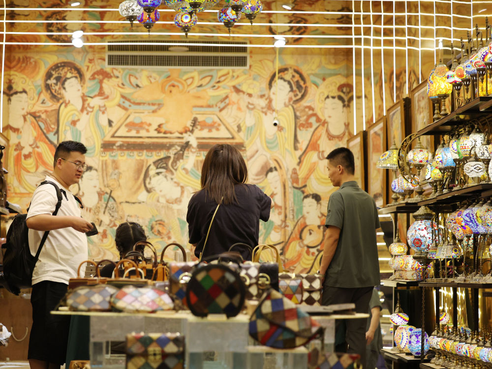 ??2025年6月26日,游客在敦煌夜市選購文創(chuàng)產(chǎn)品。今年以來,敦煌市全面改造敦煌夜市等特色街區(qū),圍繞敦煌深厚的歷史文化底蘊,融入壁畫、絲路文化等元素,通過布設文化景觀小品、打造沉浸式餐飲體驗空間、上線特色文創(chuàng)產(chǎn)品等方式,給游客帶來多元體驗,“夜經(jīng)濟”持續(xù)升溫,不斷釋放文旅消費潛力。