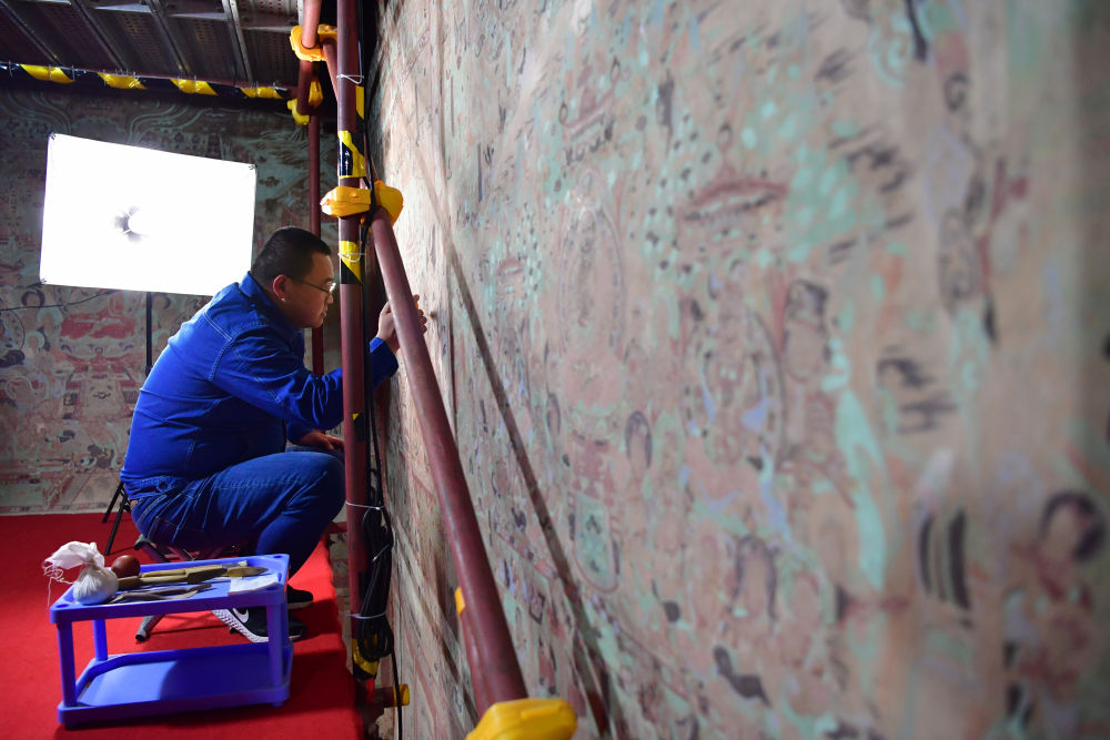 ??2022年4月19日,敦煌研究院文物保護技術服務中心的壁畫修復師楊金禮在莫高窟第231窟內(nèi)修復壁畫。