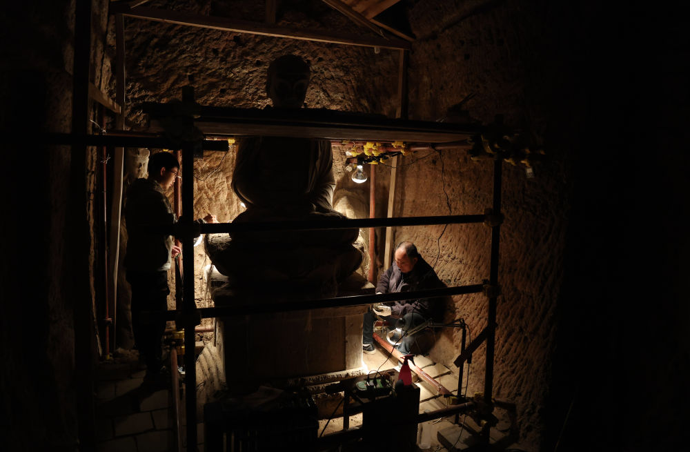 ??2024年11月2日,麥積山石窟藝術研究所保護研究室的高級文物修復師牟常有(右)和徒弟何舉在麥積山石窟133窟內(nèi)修復塑像。自1985年至今,牟常有在麥積山石窟藝術研究所工作已有四十年。經(jīng)過多年磨礪,牟常有的文物修復技藝日臻成熟,面對年輕人的請教,他更是傾囊相授?!八芟癖诋嫿允悄痰臍v史,守護它們,需要耐心和毅力,相信年輕人能夠接好接力棒,讓這份珍貴的人類文化遺產(chǎn)永續(xù)?!蹦渤S姓f。