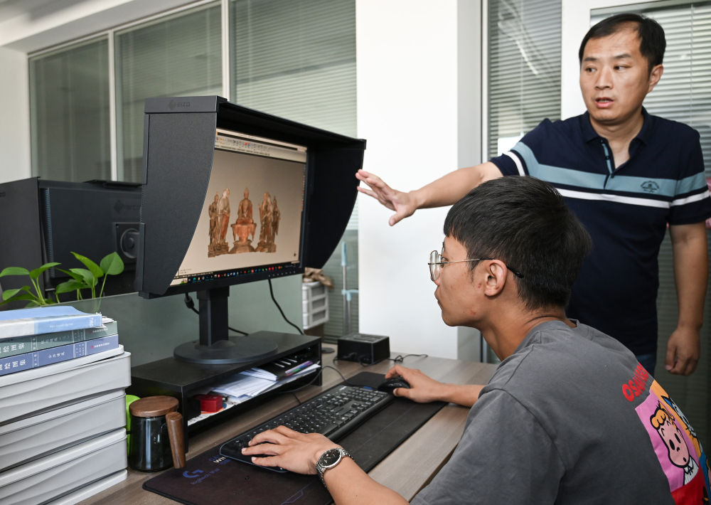 ??2023年8月3日,敦煌研究院文物數(shù)字化研究所的工作人員在展示莫高窟彩塑三維重建的成果。近年來,敦煌研究院持續(xù)加大文物保護基礎研究和應用研究,不斷加強文物科技保護力度,提升科研平臺建設,為文物保護和文化遺產(chǎn)事業(yè)發(fā)展奠定良好基礎。