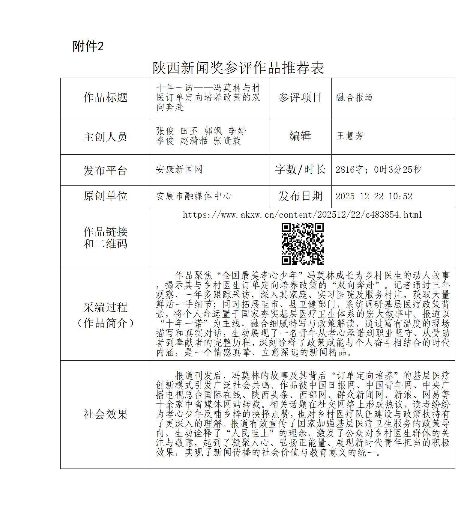 根據(jù)《陜西新聞獎、陜西省優(yōu)秀新聞工作者評選辦法》和《關(guān)于開展2025年度陜西新聞獎融合報道、應(yīng)用創(chuàng)新和新媒體新聞專欄作品推優(yōu)工作的通知》要求,經(jīng)個人申報、部門推薦和中心編委會嚴(yán)格篩選,對以下3件2025年度陜西新聞獎融合報道、應(yīng)用創(chuàng)新、新媒體新聞專欄參評作品進行公示。(作品推薦表附后)