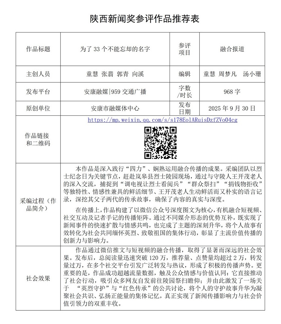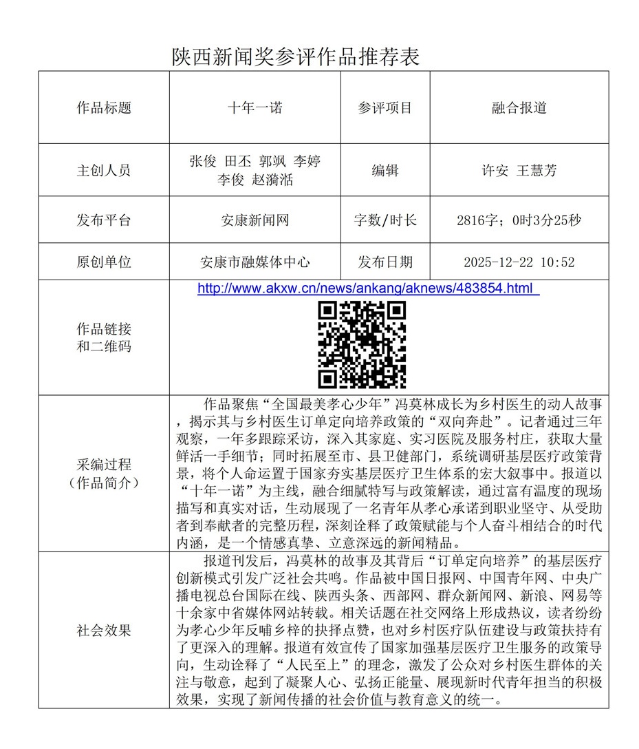 根據(jù)《陜西新聞獎(jiǎng)、陜西省優(yōu)秀新聞工作者評(píng)選辦法》和《關(guān)于開(kāi)展2025年度陜西新聞獎(jiǎng)融合報(bào)道、應(yīng)用創(chuàng)新和新媒體新聞專(zhuān)欄作品推優(yōu)工作的通知》要求,經(jīng)個(gè)人申報(bào)、部門(mén)推薦和中心編委會(huì)嚴(yán)格篩選,對(duì)以下3件2025年度陜西新聞獎(jiǎng)融合報(bào)道、應(yīng)用創(chuàng)新、新媒體新聞專(zhuān)欄參評(píng)作品進(jìn)行公示。(作品推薦表附后)