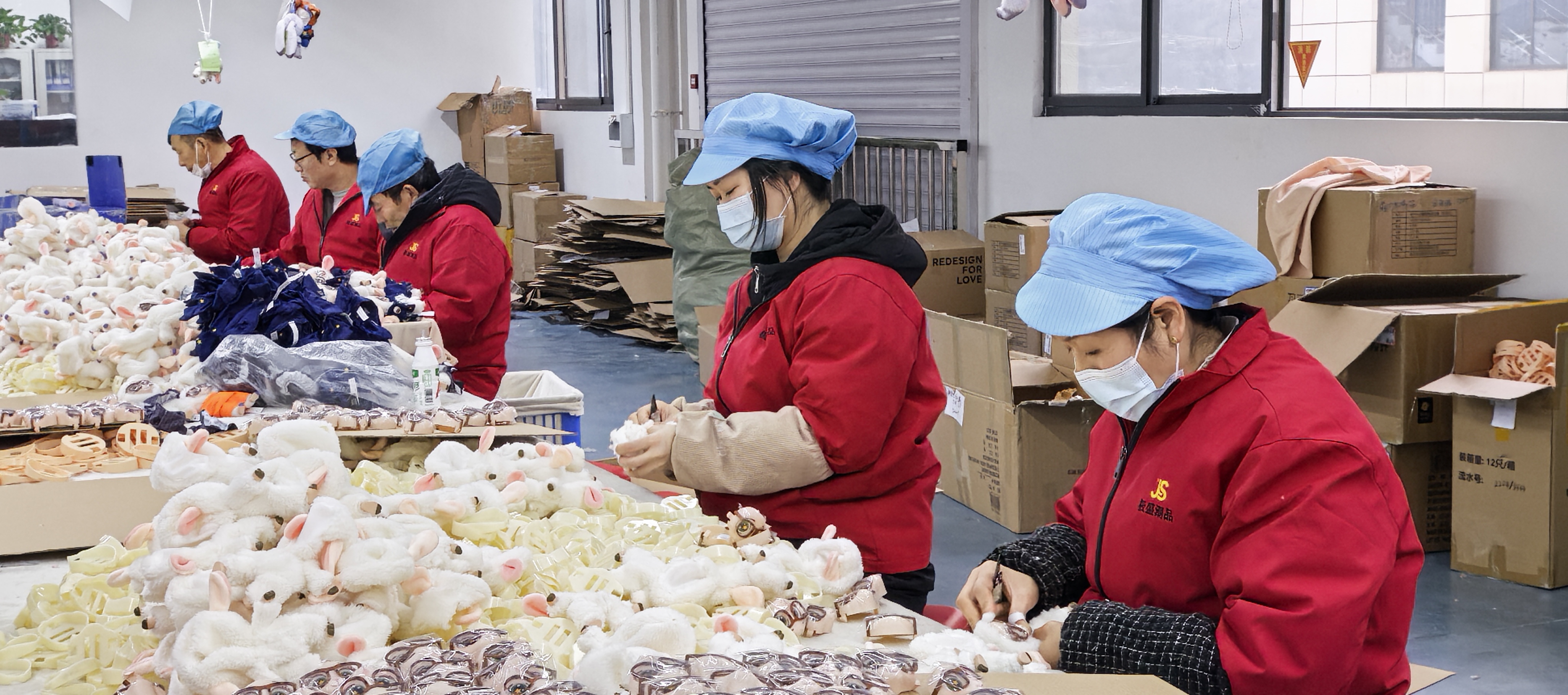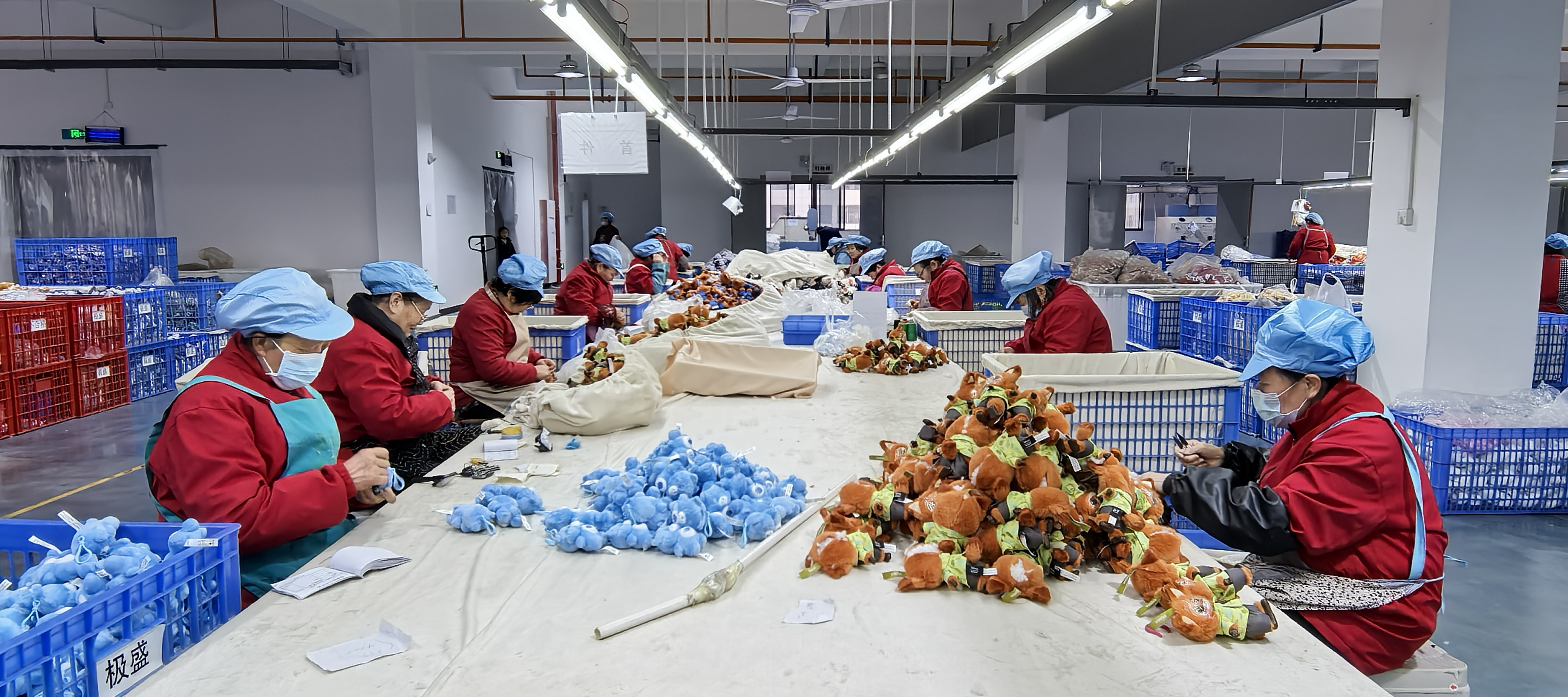 工人們正在制作熱門動(dòng)漫IP毛絨玩具。