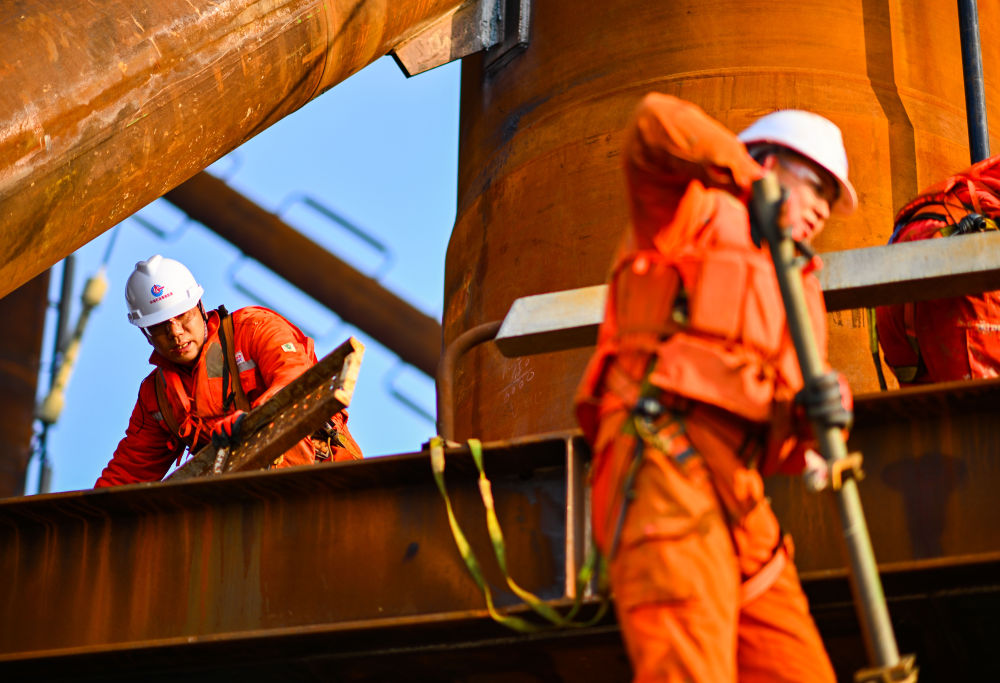 ??2026年2月13日,工人在位于渤海中部海域的渤中26-6油田開發(fā)項目(二期)作業(yè)現(xiàn)場施工。新華社記者 趙子碩 攝