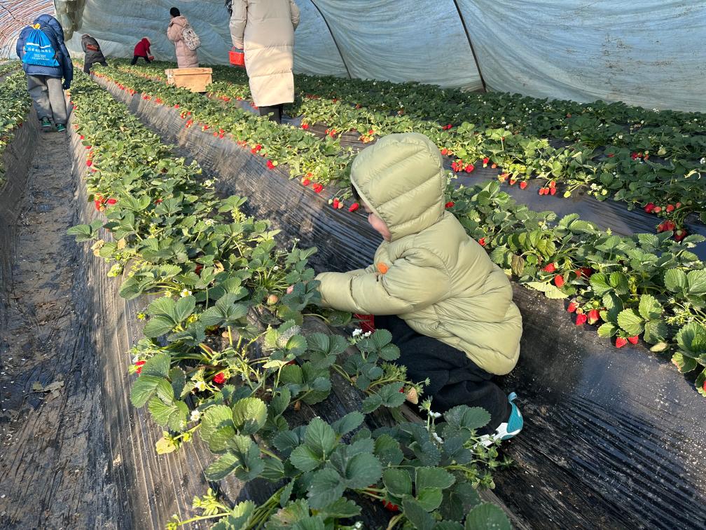 2026年1月22日,在河南洛陽孟津區(qū)送莊鎮(zhèn)十里香現(xiàn)代農(nóng)業(yè)觀光園,前來研學(xué)的孩子們體驗采摘草莓的樂趣。(受訪者供圖)