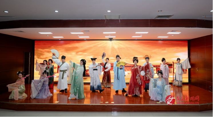 花枝映雅韻,羅衣展風(fēng)姿?;顒蝇F(xiàn)場,女員工們褪去職業(yè)裝,換上襦裙、曲裾等各式漢服,簪花綰發(fā)、輕搖團扇,一顰一笑間皆是溫婉雅致。伴隨著悠揚的古樂,一場精心編排的漢服秀驚艷開場,女職工代表緩步登臺,或頷首低眉、或淺笑嫣然,在詩詞誦讀的映襯下,將中華傳統(tǒng)服飾的典雅之美演繹得淋漓盡致?!敖韼讲蛔岉毭?,須眉亦懷雅意”,更令人驚喜的是,四位男士代表身著儒巾青衫現(xiàn)身助陣,平日里雷厲風(fēng)行的他們,化身謙謙君子,步履從容間盡顯儒雅風(fēng)范,現(xiàn)場掌聲與歡笑聲此起彼伏。