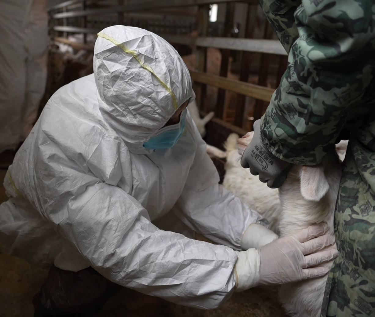 3月1日,在漢濱區(qū)關(guān)廟鎮(zhèn)唐淌村甲升興隆養(yǎng)殖合作社,畜牧獸醫(yī)師王峰身著白色防護(hù)服,蹲在羊圈邊,采集山羊血樣,為春季動物防疫工作“精準(zhǔn)把脈”。