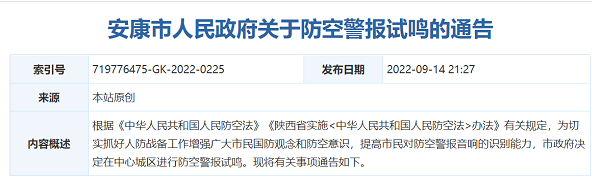為貫徹落實《中華人民共和國人民防空法》,全面提高我市防空警報快速反應和廣大群眾對警報音響識別能力,切實增強人民群眾的國防意識和對重大自然災害的防范意識,安康市政府決定,2022年9月18日(星期日)上午9時05分至9時35分在全市試鳴防空警報。請廣大市民保持正常的工作和生活秩序。cCy安康新聞網
