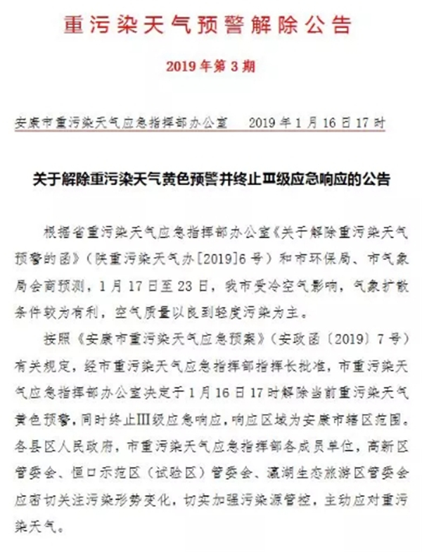 按照《安康市重污染天氣應(yīng)急預(yù)案》(安政函〔2019〕7號)有關(guān)規(guī)定,經(jīng)市重污染天氣應(yīng)急指揮部指揮長批準(zhǔn),市重污染天氣應(yīng)急指揮部辦公室決定于1月16日17時(shí)解除當(dāng)前重污染天氣黃色預(yù)警,同時(shí)終止Ⅲ級應(yīng)急響應(yīng),響應(yīng)區(qū)域?yàn)榘部凳休爡^(qū)范圍。各縣區(qū)人民政府,市重污染天氣應(yīng)急指揮部各成員單位,高新區(qū)管委會、恒口示范區(qū)(試驗(yàn)區(qū))管委會、瀛湖生態(tài)旅游區(qū)管委會應(yīng)密切關(guān)注污染形勢變化,切實(shí)加強(qiáng)污染源管控,主動應(yīng)對重污染天氣。