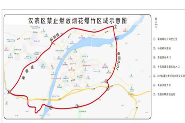 漢濱區(qū)禁止燃放煙花爆竹的區(qū)域:西起襄渝線與月河交匯處向南至馬坡嶺水源站,南起馬坡嶺水源站、香溪洞頭天門至十天高速安康東出入口,東起207省道與黃洋河大橋交匯處向北至安康東鐵路貨運(yùn)站,北起安康東鐵路貨運(yùn)站經(jīng)陽(yáng)安線、襄渝線與月河交匯處。