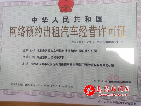 本網(wǎng)訊 (實習(xí)記者 羅偉)6月11日,安康市首張網(wǎng)絡(luò)預(yù)約出租汽車經(jīng)營許可證發(fā)放,將進(jìn)一步滿足我市社會公眾多樣化出行需求,規(guī)范網(wǎng)絡(luò)預(yù)約出租汽車經(jīng)營服務(wù)行為,促進(jìn)出租汽車行業(yè)和互聯(lián)網(wǎng)融合發(fā)展。ehN安康新聞網(wǎng)