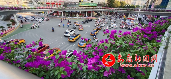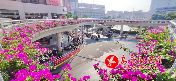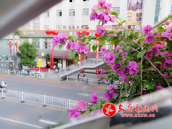 本網(wǎng)訊 (記者 艾蓓)日前,記者途徑安康城區(qū)各大人行天橋時發(fā)現(xiàn),一抹鮮艷的色彩映入眼簾,遠遠地就看到一簇簇三角梅沿著天橋欄桿一字排開,玫紅色的花朵在綠葉的映襯下更顯絢麗。原本“呆板乏味”的人行天橋在鮮花的裝扮下,變得姿態(tài)萬千,生氣十足,人在橋上行走,仿佛在花廊中穿行,讓人心曠神怡。