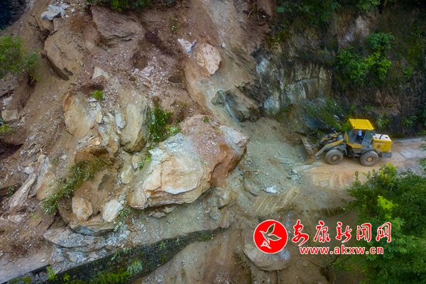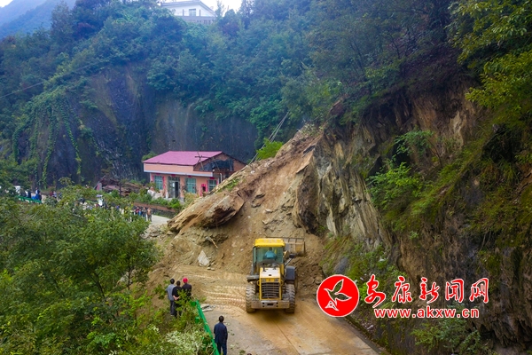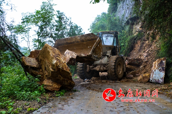 連日來的持續(xù)強降雨導致漢濱區(qū)境內(nèi)農(nóng)村公路水毀比較嚴重,多處路段相繼發(fā)生山體滑坡。災情發(fā)生后,漢濱區(qū)農(nóng)村公路管理局立即組織30余臺大型機械進行搶險,目前已搶通道路40條,還有5條正在搶通中。9月18日,一臺機械正在清理受災道路的垮塌土石。(記者 張喬 通訊員 張昊 攝)vN7安康新聞網(wǎng)