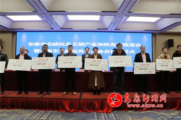 會上,趙俊民與于福亮共同為安康市毛絨玩具行業(yè)協(xié)會揭牌,協(xié)會新當(dāng)選會長沈愛華作表態(tài)發(fā)言。會議還向30余家企業(yè)兌現(xiàn)了毛絨玩具文創(chuàng)產(chǎn)業(yè)發(fā)展基金獎勵。
