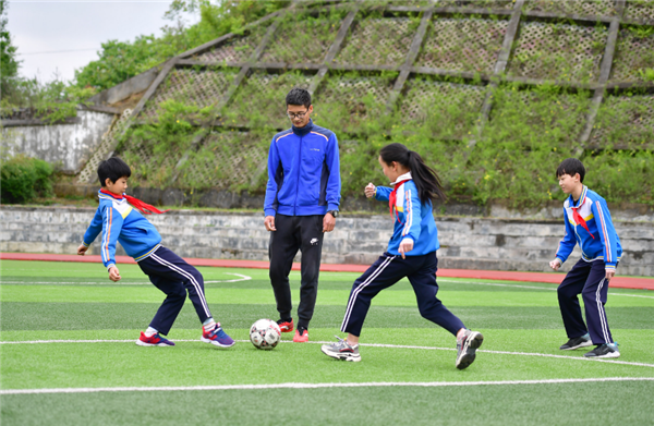↑4月22日,平利縣老縣鎮(zhèn)中心小學(xué)的學(xué)生在操場上踢球。