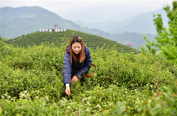 ↑4月22日,在平利縣老縣鎮(zhèn)蔣家坪村茶業(yè)現(xiàn)代示范園區(qū),茶農(nóng)周麗在采茶。