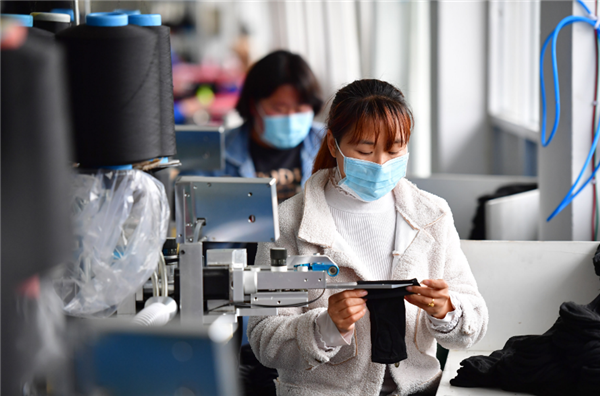 ↑4月22日,在平利縣老縣鎮(zhèn)錦屏社區(qū)的社區(qū)工廠,工人在加工襪子。