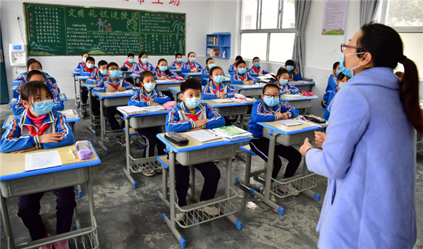 ↑4月22日,平利縣老縣鎮(zhèn)中心小學(xué)五一班的學(xué)生在上課。