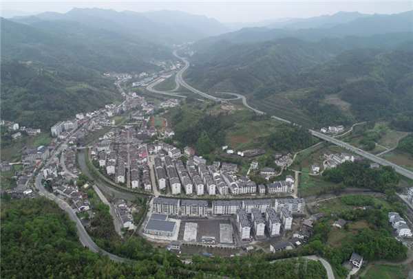 ↑平利縣老縣鎮(zhèn)錦屏社區(qū)景色(4月22日攝,無人機(jī)照片)。