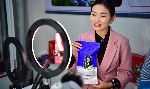 ↑4月22日,在平利縣老縣鎮(zhèn)錦屏社區(qū)一間直播間,平利縣尋夢農(nóng)園絞股藍(lán)合作社負(fù)責(zé)人王秀梅在電商平臺(tái)上推介平利縣特色食品。