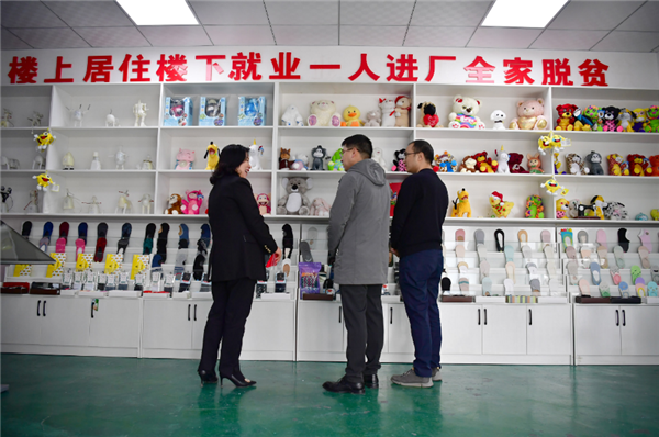 ↑4月22日,在平利縣老縣鎮(zhèn)錦屏社區(qū)的社區(qū)工廠,一家企業(yè)負(fù)責(zé)人顧芝紅(左一)向客人介紹產(chǎn)品。