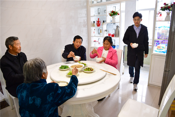 ↑4月22日,平利縣老縣鎮(zhèn)錦屏社區(qū)居民汪顯平一家在新房吃午飯。