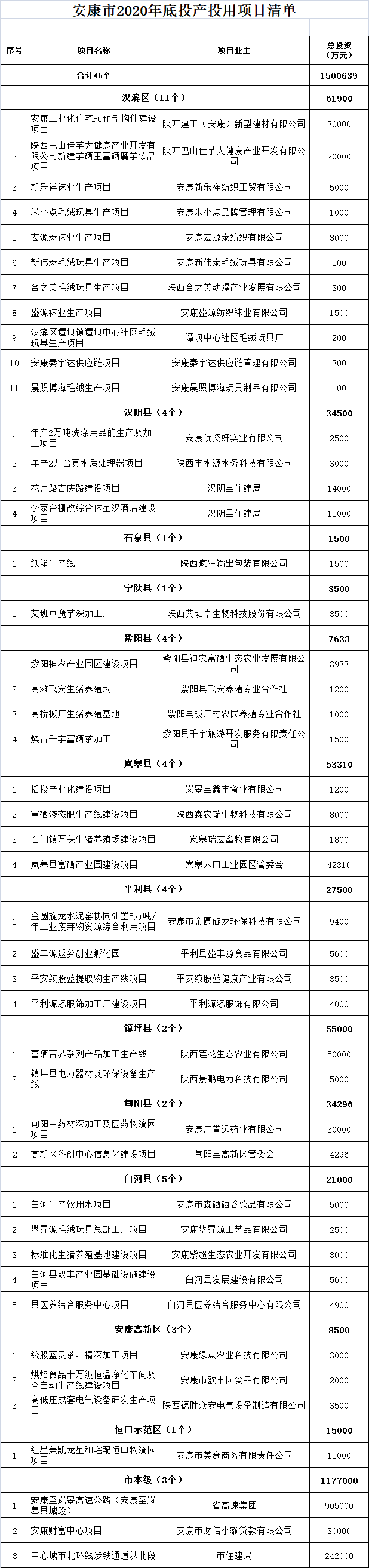 安康市2020年底集中投產(chǎn)投用重點項目清單