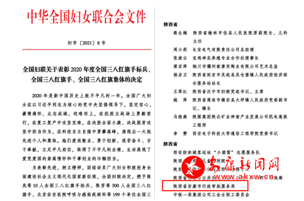 本網(wǎng)訊(通訊員 李倩)“三八”國際勞動婦女節(jié)前夕,全國婦聯(lián)表彰了一批全國三八紅旗手標兵、全國三八紅旗手和三八紅旗集體。安康市行政審批服務局榜上有名,作為全省六個、全市唯一的單位,榮獲“全國三八紅旗集體”榮譽稱號。