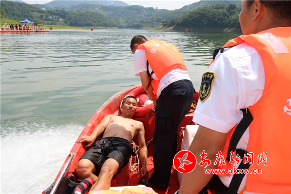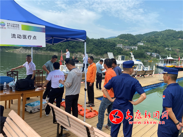 自然水域水上競賽項(xiàng)目安全保障有著迥異于陸地項(xiàng)目的難點(diǎn):地域廣闊,事發(fā)地與醫(yī)療施救地距離較遠(yuǎn);運(yùn)動員賽中意外發(fā)生地地形復(fù)雜,施救難度大,運(yùn)載距離長,需要公安、消防、海事、醫(yī)療、屬地管控等水陸緊密高效協(xié)調(diào)配合才行。十四運(yùn)會安康競委會全程堅(jiān)持底線思維,始終將安全保障工作置于重要位置,在前期有效舉行陸路交通、水上救援綜合演練等基礎(chǔ)上,再次匯集各方力量舉行運(yùn)動員賽中遇險(xiǎn)專項(xiàng)全要素救援演練,切實(shí)做好確保馬拉松游泳測試賽安全保障工作。
